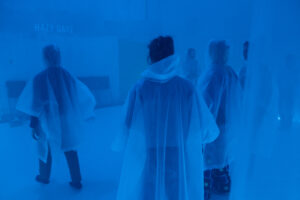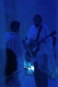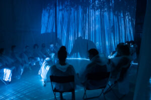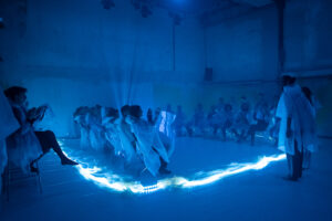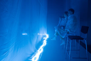 This is a performative interactive installation-in-motion. The audience sits within and around the installation and experiences, through sound and movement, the transformation of space over the duration of the work.